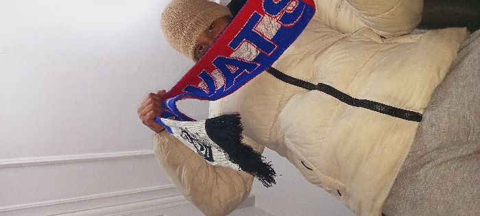 A person wearing a tan knit cap and beige puffer jacket holds a red, white, and blue scarf that partially obscures their face. The scarf features the word "WATTS" in large letters and has black and white tassels at the end. The person stands near a white wall and a staircase. The jacket has a horizontal black band across the chest. The overall impression is a casual and somewhat obscured portrait.