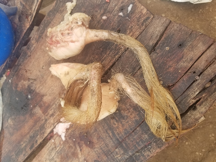 two pieces of raw meat on a wooden surface. The meat is pale pink and has long, light brown hair attached. The surface is made of wooden planks, some of which are cracked and worn. The coordinates provided place the location in Pati Ridge, Nigeria. The image appears to have been taken indoors, possibly in a kitchen or market stall. No people are visible in the image.