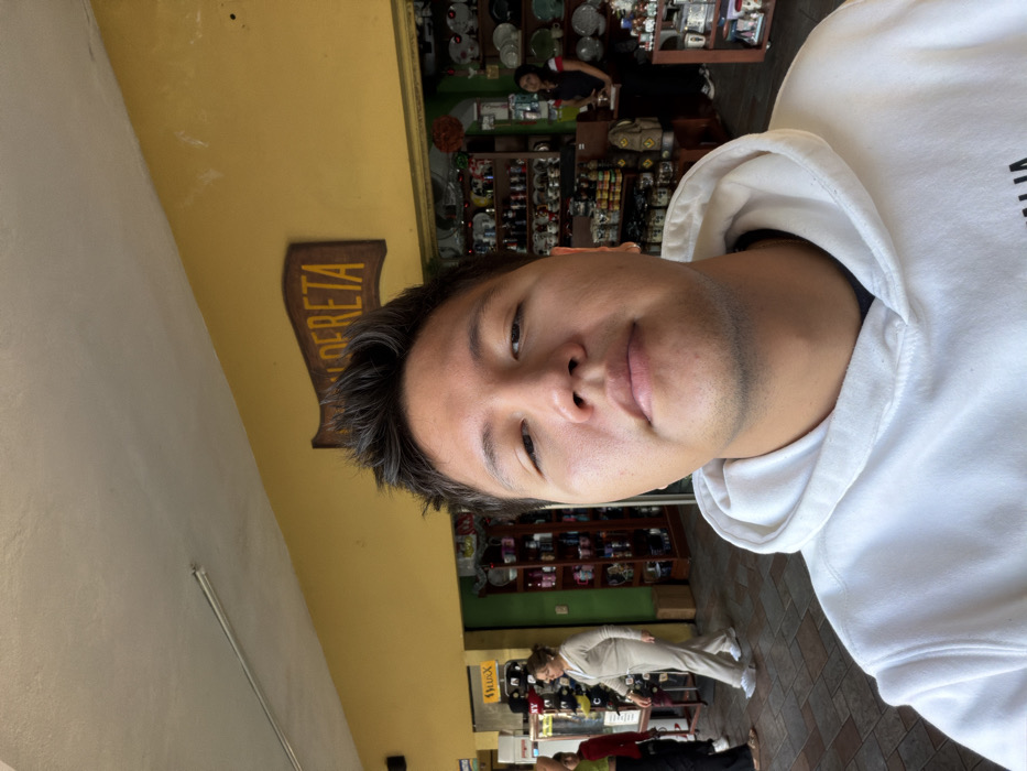 A rotated, slightly blurred selfie of an Asian man in a white hoodie. He's indoors, likely a shop, judging by the shelves of items and other people visible in the background. A wooden sign with lettering is mounted on the wall. The lighting is bright and the background is filled with miscellaneous items and shoppers, contributing to the store's ambiance.