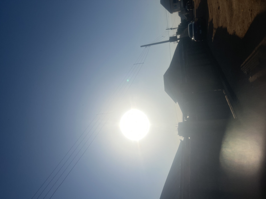 A bright sun dominates the center of the image against a clear blue sky. Power lines extend from the left toward the sun. To the right, dark buildings and vehicles line a street. The image is slightly out of focus at the bottom right, with a bright flare. The overall scene depicts a sunny day in an urban environment.