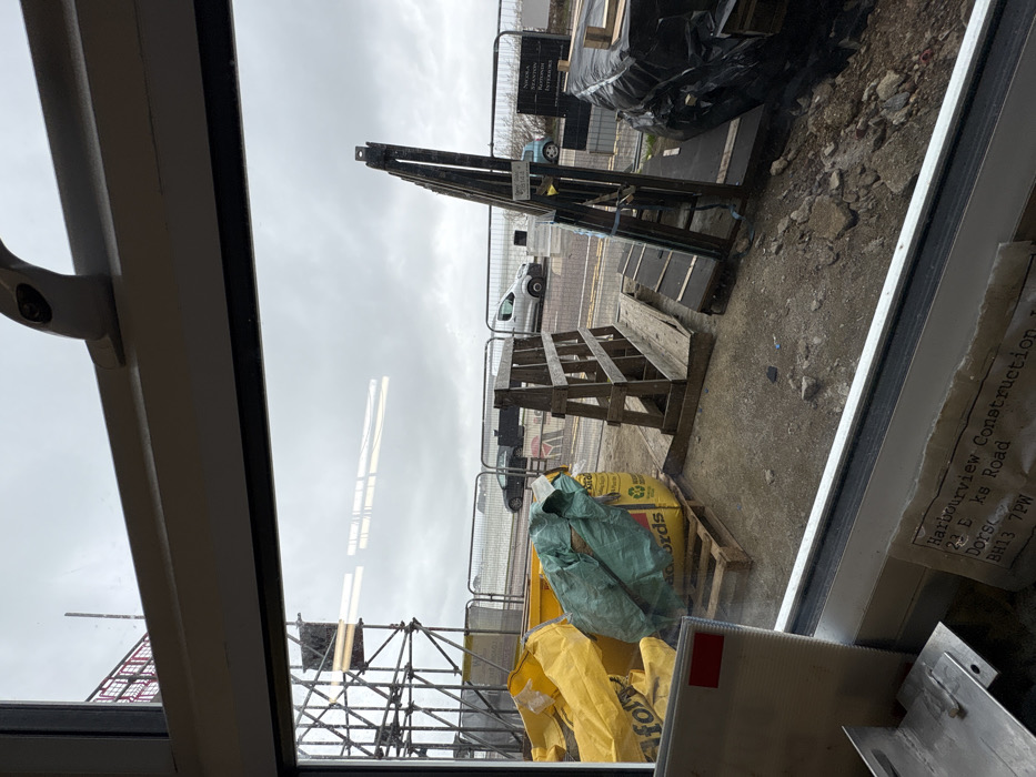 The image provides a view from inside a building, looking out through a window onto an exterior construction site on an overcast day