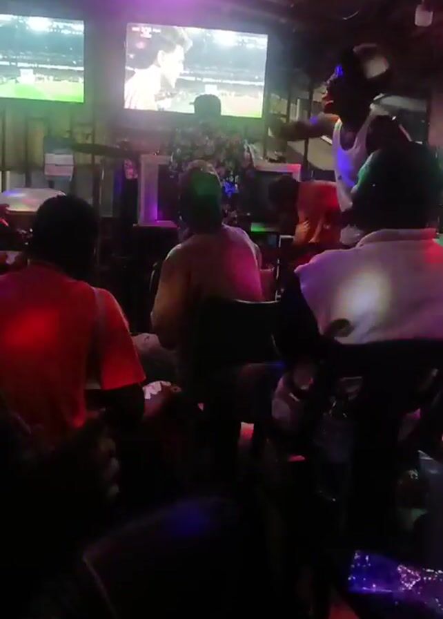 group of people in a dimly lit bar, watching sports on two large televisions mounted above the bar. The lighting is a combination of colored lights (red, blue, pink, and green) that create a vibrant but dark atmosphere. Most of the individuals are seated on chairs and stools, facing the televisions. One man, wearing a white tank top and a hat, is standing and moving, possibly dancing or reacting to the game. Other people are visible only from the back and sides. The environment appears lively, with sounds of music or commentary mixing in the background. The overall setting suggests a social gathering to watch a sporting event in a casual bar.