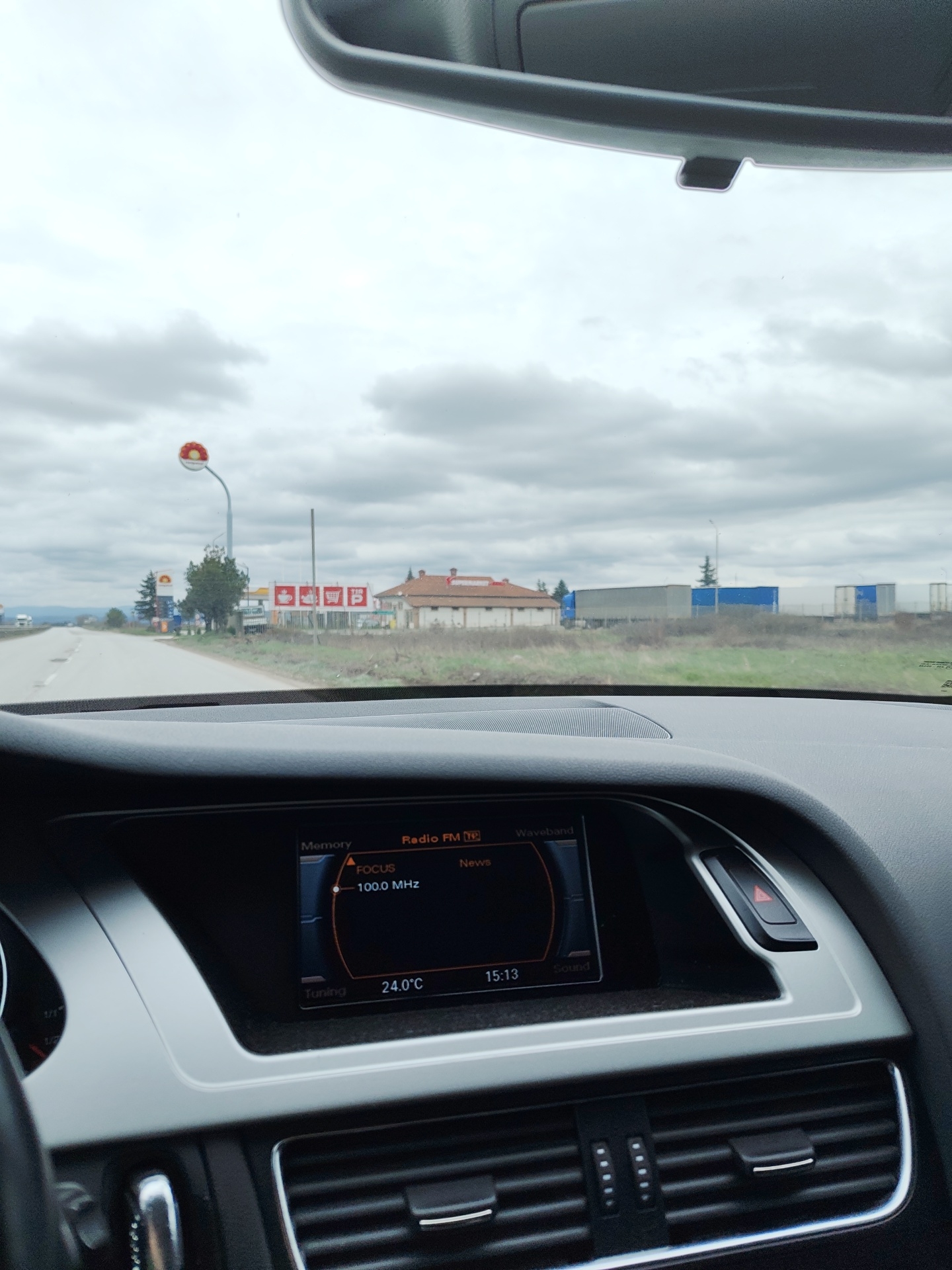 view from inside a car, likely on a road leading into or out of Moravitsa, Bulgaria. Through the windshield, a highway stretches into the distance under an overcast sky. On the right side of the road, there's a Shell gas station and a row of signs promoting coffee, tea, and other services. Further back, a building with a red-tiled roof is visible, along with several large trucks parked in a lot. The car's dashboard is prominent in the foreground, displaying a radio tuned to FOCUS 100.0 MHz, a temperature of 24.0°C, and the time as 15:13. The interior appears clean and well-maintained.