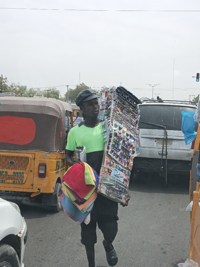 The scene depicts a daytime urban street in Hotoro, Nigeria. A dark-skinned male street vendor, wearing a black newsboy-style cap, a lime green and dark two-tone t-shirt, and dark shorts or trousers with black slide sandals, is positioned centrally, walking forward. He carries two distinct sets of merchandise: in his left arm, a stack of brightly colored, folded cloths or towels (red, lime green, blue, yellow, grey); and in his right arm, a large, rectangular display board showcasing numerous small items such as sunglasses, keychains, and other trinkets arranged on hooks. In the immediate background to the vendor's left is the rear of a yellow and brown tricycle auto-rickshaw, displaying a red rectangular window and white lettering including "KANO STATE." Further back, behind the vendor, a silver or light-colored SUV or minivan is visible, partially obscured. A small portion of a white vehicle is present in the lower-left foreground. The road surface is asphalt. Utility poles, wires, and a green traffic light are visible against an overcast sky. Distant buildings and sparse vegetation line the horizon.