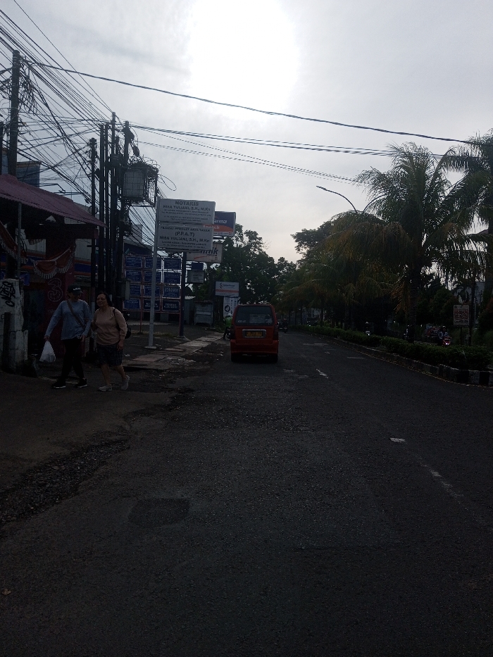 The image displays an urban street scene under an overcast sky. Two individuals walk on a cracked concrete sidewalk along the left side of the frame, moving away from the camera. The person on the left wears a light-colored top and dark pants, carrying a white bag. The person on the right wears a light brown top and dark patterned shorts. Adjacent to them, on the asphalt road, a red van, possibly a Suzuki Carry, is visible, facing away from the viewer. Its rear license plate is partially discernible as "BE 1606 CA". On the left, multiple utility poles are heavily strung with a dense network of black electrical wires and feature two mounted transformers. Beneath these poles, a cluster of signs identifies a legal office, specifically "NOTARIS NISA YULIANI, S.H., M.Kn" and "PEJABAT PEMBUAT AKTA TANAH (P.P.A.T.) NISA YULIANI, S.H., M.Kn", with the city name "BANDAR LAMPUNG" also visible on the signs. Behind these signs, a large billboard with "Farma" is partially visible. The road surface exhibits potholes and cracks. To the right, the road is bordered by a concrete median strip featuring lush tropical vegetation, including several palm trees. A street light extends over the road from the right. In the far distance on the right, blurred outlines of additional vehicles, possibly motorcycles, are present. The scene is located in the city of San Pya, Myanmar.