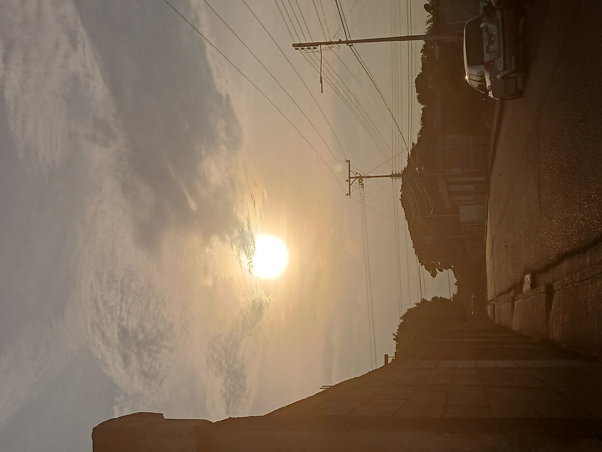 The image depicts a street scene at dusk or dawn in an urban environment. The sun is visible through the clouds, casting a golden glow. Overhead power lines traverse the sky. A vehicle is parked on the right side of the street. Buildings and vegetation line the edge of the road. A wall or structure appears in the foreground.
