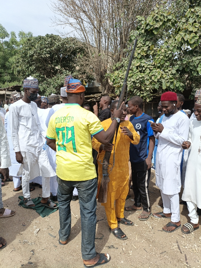 In Gama, Nigeria, a daylight outdoor scene depicts approximately a dozen men gathered on an unpaved, light brown ground. Central to the image, a man stands with his back mostly to the viewer, wearing a yellow t-shirt with "EDERSON 09" in green text on the back, blue jeans, and a multi-colored patterned cap. He faces a man in bright yellow traditional attire who holds a long, dark, antique-style firearm (likely a rifle or shotgun) vertically with both hands, its wooden stock and a blue cord wrapped around its barrel evident. Both men are looking towards each other, and the man with the firearm is smiling. Surrounding these two, several other men are present. To the immediate left of the man in the yellow shirt, a man in a white traditional robe and white cap wears a black face mask and white earphones. To the right of the man with the firearm, another man in a white traditional robe and a red cap is observed looking at a smartphone held in both hands, also wearing white earphones. Other individuals in the background are dressed in various traditional white robes, blue t-shirts, or other casual wear. Most individuals are wearing sandals. A small piece of dark green fabric lies on the ground to the left of the central figures. The background features several trees with both dense green foliage and bare branches under a bright sky, with faint outlines of structures visible behind the vegetation.