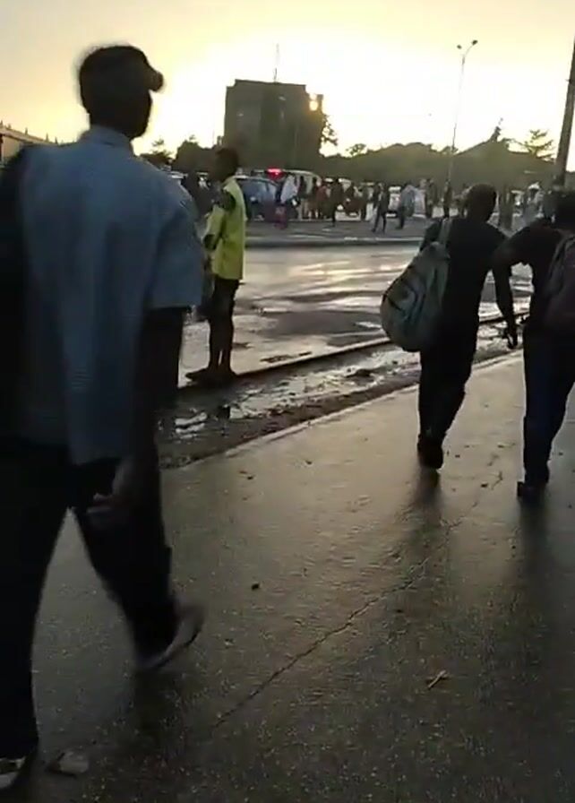 several people walking along a wet roadside. Some are carrying bags. In the background, there are cars driving on a bridge and a building. The sky is dusky.