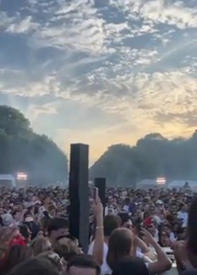 large crowd of people at an outdoor music festival. The crowd is dense, and many people are holding up their phones to record the performance. There are two tall black speaker towers in the foreground. In the background, there is a stage with lights and a haze of smoke. The sky is cloudy with the sun setting. Trees line the perimeter of the concert space.