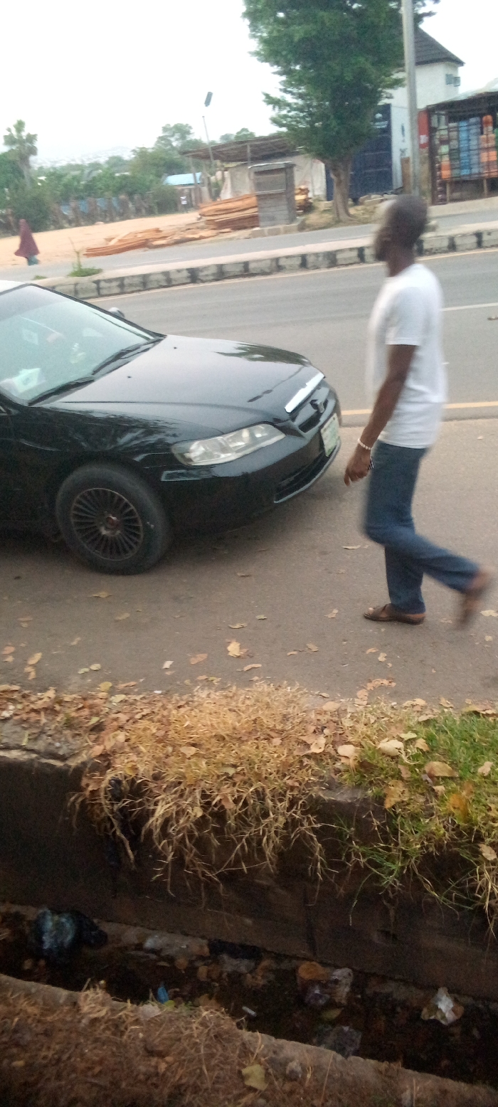 The scene depicts a street in Adankolo, Nigeria. In the immediate foreground, a concrete drainage ditch runs horizontally, partially obscured by dry brown grass and scattered fallen leaves, containing visible refuse including plastic bottles and dark debris. Above the ditch, a paved asphalt road is visible. On the road, a black four-door sedan, consistent with a Honda Accord model, is parked facing left, occupying the right side of the frame. Its front bumper and a portion of the hood are visible, along with its headlights and a multi-spoke dark rim on the front passenger wheel. A Nigerian license plate is partially obscured on the front. A male individual, with dark skin and closely cut hair, walks left-to-right across the mid-ground, positioned on the asphalt road next to the parked sedan. He wears a plain white short-sleeved t-shirt, blue jeans, and brown sandals. A light-colored bracelet is visible on his left wrist. His face is turned away from the camera and is motion-blurred, suggesting movement. Beyond the road, a low concrete curb separates the asphalt from an unpaved area. In the background, to the left, a blurry figure wearing a reddish garment, possibly a hijab or long dress, walks from left to right on a dirt patch. Behind this figure, large stacks of cut lumber are piled on the ground next to a covered, open-sided structure. Further right in the background, a light-colored building with a dark roof and a large dark gate is visible, along with another structure featuring a display of consumer goods, likely a shop or kiosk. Various trees, including a palm tree, and an overhead street lamp are also present in the background against an overcast sky.