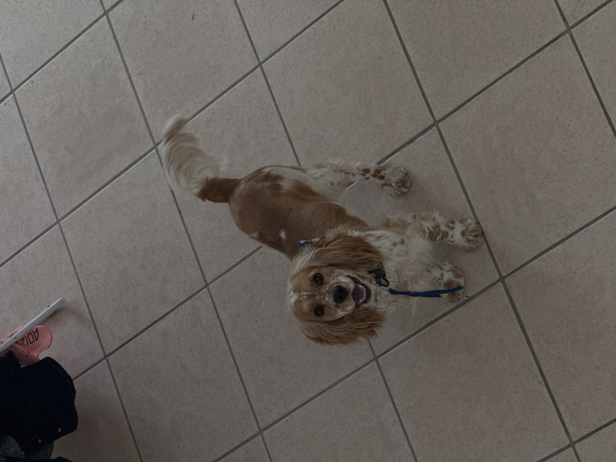 A tan and white Cocker Spaniel is standing on a tile floor, looking up at the camera