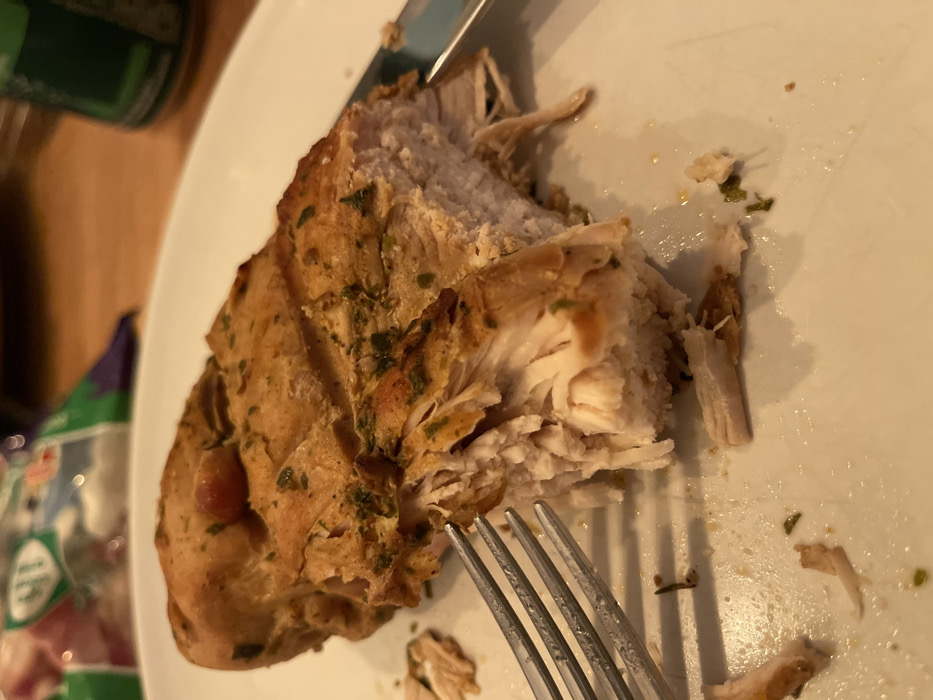 A close-up shot reveals a portion of cooked turkey or chicken on a white plate. The meat is partly sliced and shredded, displaying a light, moist interior. The skin is golden brown, seasoned with green herbs. A fork and a knife are visible, used to cut the meat. The plate has some scattered remnants of the meal. A green can and a purple and green package are blurred in the background.