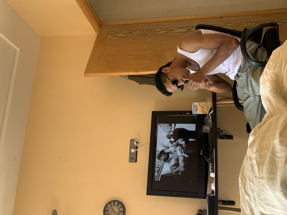 The scene depicts an indoor room in Sebaa Rouadi, Morocco. The room features light orange-beige painted walls and a white ceiling. A male individual, appearing to be in his 20s or 30s, with dark curly hair and dark aviator-style sunglasses, is seated in a black office chair. He wears a white tank top and light grey cargo-style pants. He is actively using a silver lighter to ignite a cigarette or similar hand-rolled item held in his left hand, near his mouth. In front of the man, a black flat-screen computer monitor, possibly an LG brand, displays a black and white image of two men, one prominently featured (resembling The Notorious B.I.G.) in the foreground and another behind him. A black keyboard and mouse are visible on the light wooden desk supporting the monitor. A clear glass containing a light beverage, a white box of "Fibre Oat" product, and a small, clear circular container, possibly an ashtray, are also present on the desk. To the left of the monitor on the wall, a dark-framed round wall clock with Roman numerals is mounted. Below the clock, a dark grey electrical outlet with two sockets and a white power strip with a plug are affixed to the wall. A light wooden door with a carved floral pattern on its surface is partially open on the right side of the frame, revealing a darker interior beyond. A dark garment hangs behind the open door. In the lower left foreground, a bed with rumpled white bedding is visible.