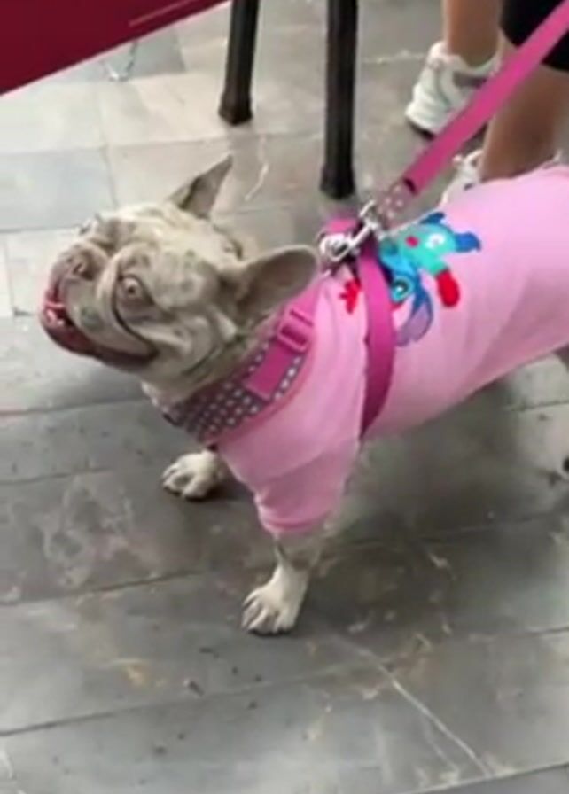 A small, grey, brindle French Bulldog wearing a pink shirt with a Stitch design and a pink harness with decorative studs, stands on a grey tiled floor