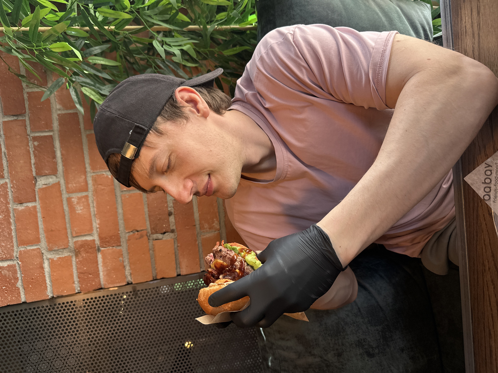 A man wearing a black baseball cap and a pink t-shirt is intently looking at a burger he is holding in his gloved hands. The burger appears to be gourmet and has several toppings. The man is seated in what appears to be an outdoor seating area of a restaurant. In the background, there is a brick wall partially covered with green foliage and a perforated metal screen. A portion of the Baboy restaurant menu is visible on the right. This restaurant is located in the city of Saint Petersburg, Russia.