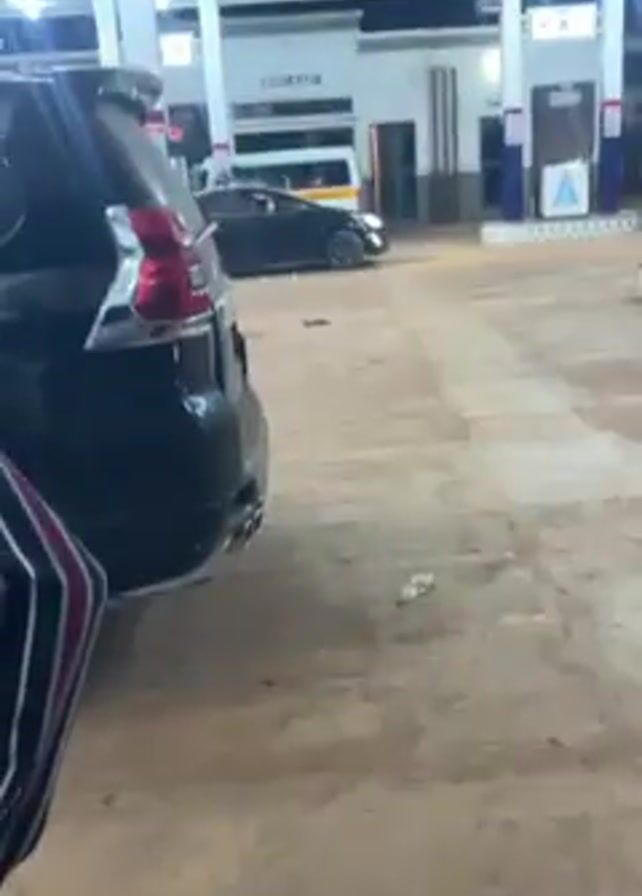 gas station at night. A dark-colored Toyota Land Cruiser Prado is parked near the gas pumps. Another car, also dark, is visible in the distance. A person wearing a striped shirt stands next to the Prado. The ground is dirt and concrete. There is a red fire extinguisher next to a gas pump, which is decorated with white, gray, and black mosaic tiles. The gas station has white buildings with dark roofs. A sign reads "PMS 7" and "PMS 8".