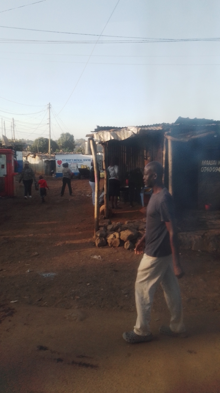 A man in a grey shirt and light pants walks along a dirt path, wearing closed-toe sandals. Behind him, a rudimentary structure with corrugated metal roofing stands next to a dark building with painted words and numbers. Further back, people gather near a building labeled "St. Mary's Medical Centre". Overhead, power lines stretch across a bright sky. A red kiosk stands to the left of the medical centre. The scene suggests an impoverished urban environment.