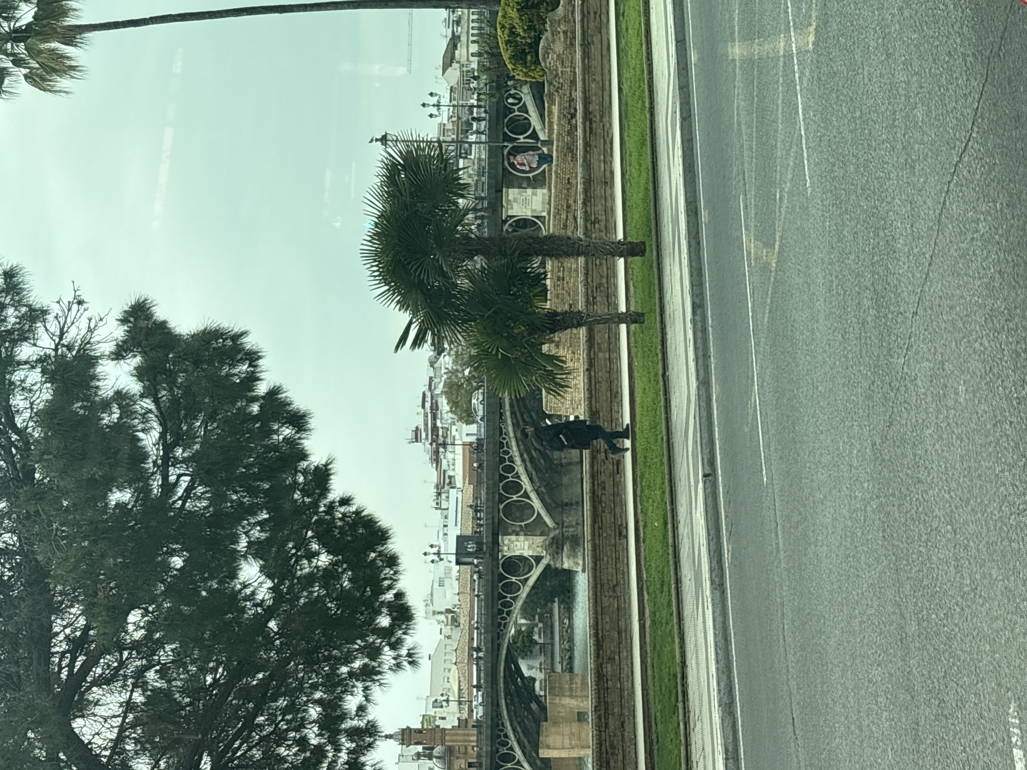 This image captures an outdoor urban scene in Seville, Spain, depicting a view of the Puente de Isabel II (Triana Bridge) over the Guadalquivir River on an overcast day. In the foreground, a gray asphalt road occupies the bottom portion of the frame, featuring white and faded yellow lane markings. Above the road, a strip of green grass forms a median, followed by a light-colored paved sidewalk. On this sidewalk, one individual dressed in a dark jacket and dark trousers is walking from left to right. They appear to be carrying a dark backpack or bag on their back. Two small, bushy palm trees with prominent fronds stand on the sidewalk to the right of this individual. To the far right, the trunk of a taller, slender palm tree is visible. Overhanging dark green pine tree foliage occupies the upper left quadrant of the frame. The midground features the Guadalquivir River, whose light blue-green water flows under the multi-arched Puente de Isabel II. This historic iron bridge, characterized by large circular decorative elements along its main structure, connects the city center to the Triana neighborhood. Numerous smaller figures, indicating pedestrians, are visible traversing the bridge, and two white cars are present on its roadway. On the far left bank of the river, a brown, square stone structure stands before the bridge's first arch. Above the bridge, a cluster of white and light-colored buildings with reddish-brown roofs line the riverbank. A distinctive domed tower with arcaded sections is visible on the far left, beyond the bridge. Ornate black streetlights are positioned on the bridge and along the river's edge. The background consists of the dense urban fabric of the Triana neighborhood, characterized by white buildings and rooftops. The sky is uniformly light gray and overcast, indicating diffused natural lighting conditions. A small bird is perched on top of a streetlight pole visible between the two small palm trees and the bridge.