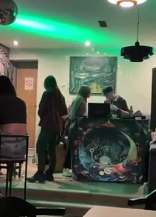 The video depicts a bar or lounge setting with green lighting, where a DJ is setting up equipment, including a laptop and mixer, on a raised platform