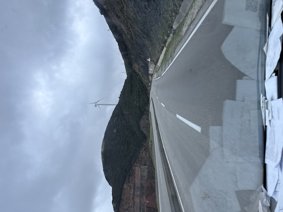 A winding road stretches towards the horizon, hugging the base of a rugged, verdant mountain under a cloudy sky. Several wind turbines are visible along the mountain ridge. The view is likely from inside a vehicle, as evidenced by the cluttered side window with documents and reflections.