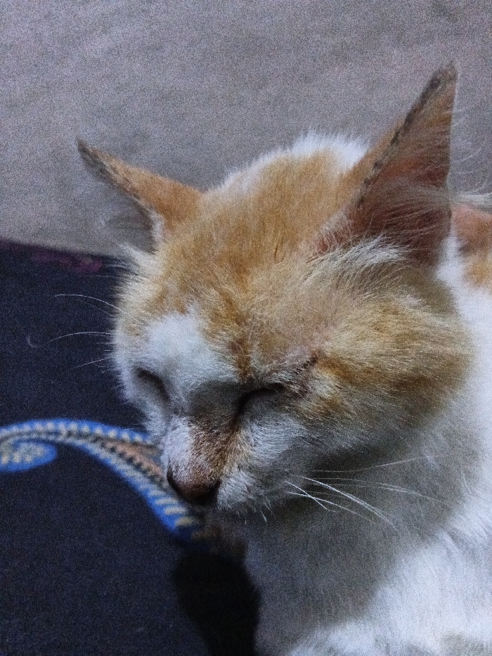 A close-up shows a resting cat. The cat has orange and white fur, with the orange concentrated on the top of the head and ears. Its eyes are closed, and the cat's face displays tranquility. Whiskers are visible near the nose. The cat rests on a surface with a blue and brown patterned edge against a textured, light grey background.