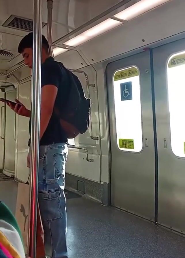 The interior of a train car, possibly a subway, is captured from the perspective of a seated passenger. The car is brightly lit with horizontal fluorescent lights. To the right, a young man with dark hair, wearing a black t-shirt, light blue jeans, and a black backpack, stands holding a smartphone. A Puma bag is visible on the floor next to him. To the left, another young man with dark hair and sunglasses stands holding a jacket. He briefly appears in the frame before the camera focuses on a woman with curly dark hair and sunglasses, wearing a red tank top and a backpack. She is seated and leaning against the side of the train car. In the background, other passengers can be seen seated along the sides of the car. The train car has accessibility signage on the doors. The floor has a speckled gray pattern.