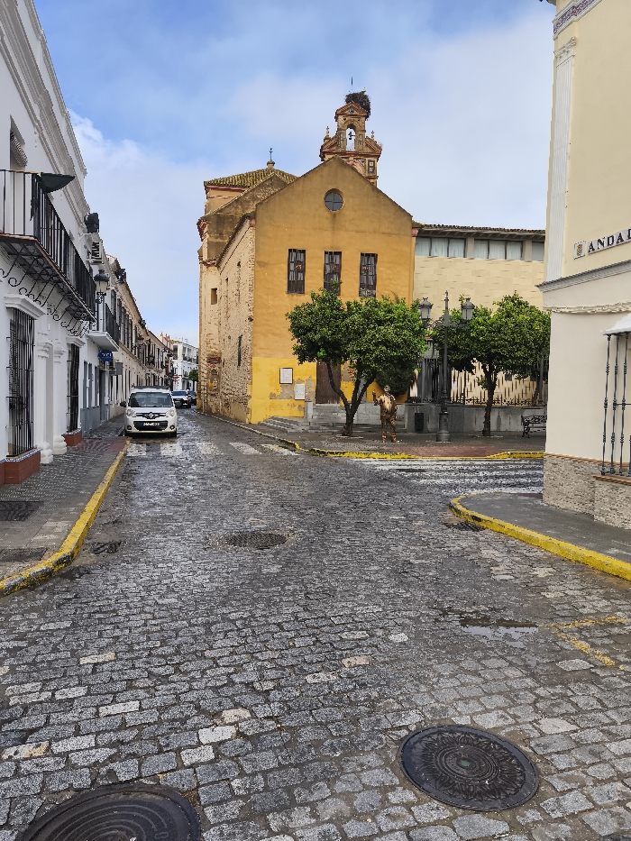 This detailed image captures a damp, cobblestone street scene in Moguer, Huelva, Spain, specifically looking towards the Convento de San Francisco from Calle Andalucía