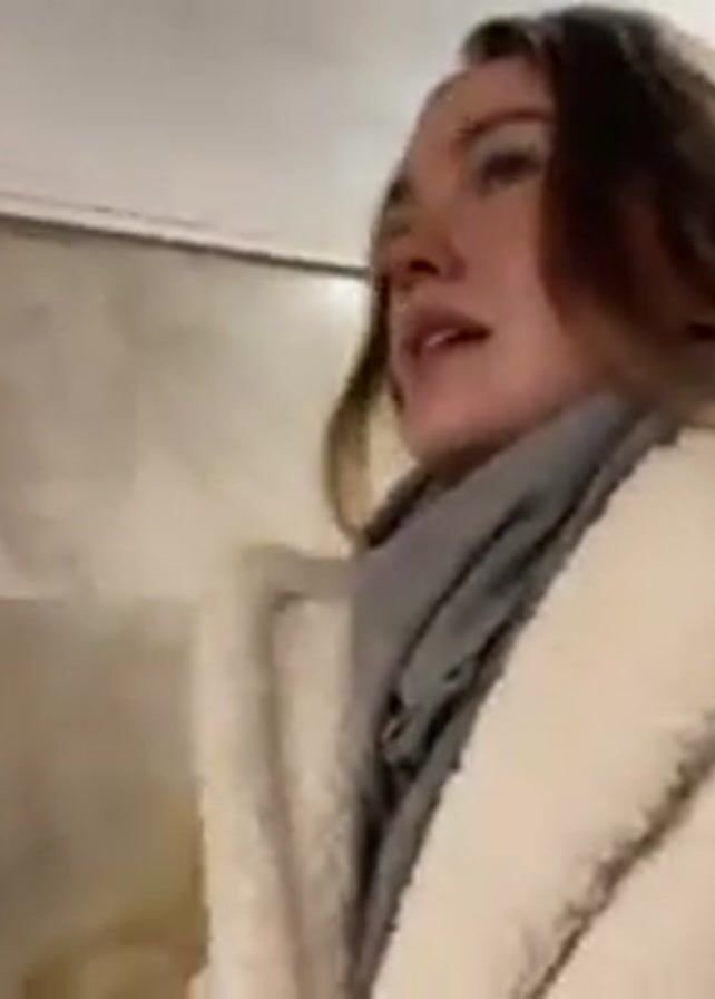 A woman in a white fluffy coat and gray scarf walks through what appears to be a subway station