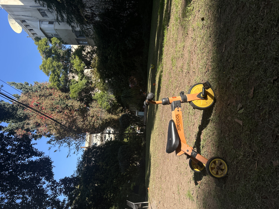 - "An orange and black children's tricycle, featuring yellow wheels and pedals and labeled "KIWI COOL," is positioned in the foreground on a patch of dry grass and dirt, facing right, partially illuminated by direct sunlight" by FM-PydNS2, licensed under CC BY 4.0
