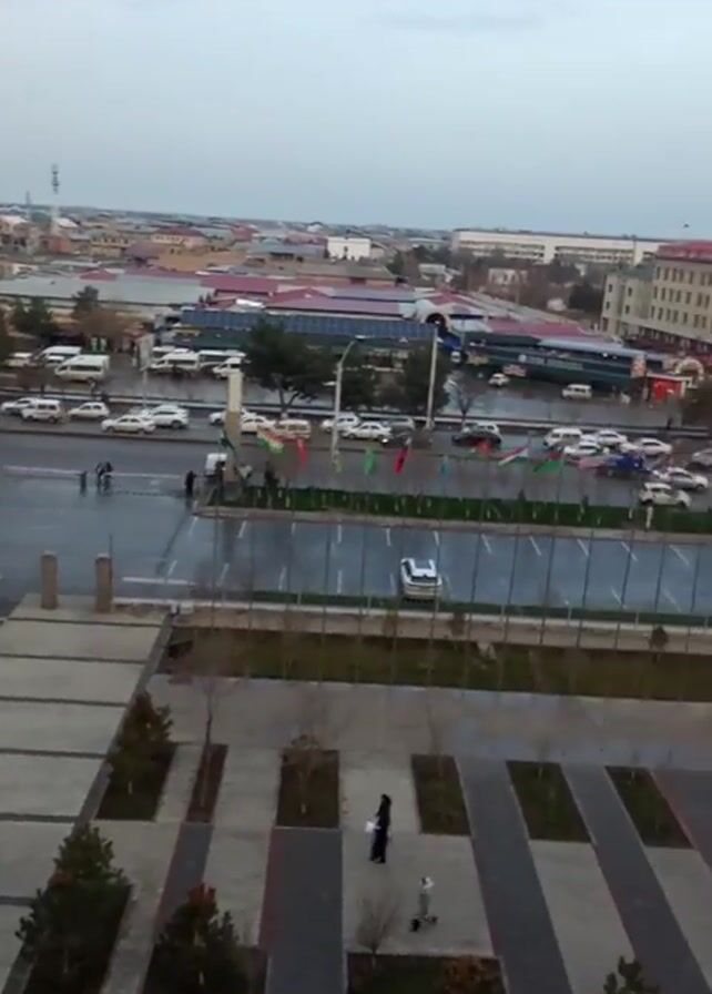 n outdoor urban scene. The viewpoint is elevated, possibly from a building, looking down onto a square or plaza. There are several people walking around the plaza. In the background, there is a wide street with cars and a large building complex. Flags are flying along the median of the street. The sky is overcast. A statue stands in the lower right foreground.