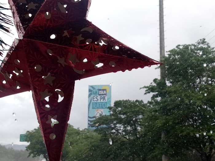 A close-up shot shows a wet, red star decoration hanging outdoors in the rain. The star has cut-out shapes of stars and moons, and raindrops cling to its edges. Behind the star, the background is blurred, showing trees and a tall billboard with the words "LA ISLA ES PA..." written on it. The overcast sky suggests a gloomy, rainy day.