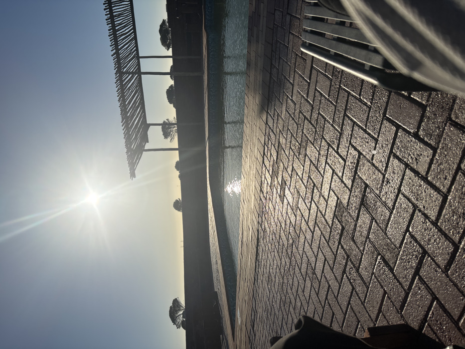 The image depicts an outdoor swimming pool area in Port Alfred, South Africa, at either sunrise or sunset. The low sun, positioned in the upper center-left, casts significant lens flare and long shadows. In the immediate foreground, a patterned brick paver surface, appearing damp or reflective, extends across the bottom half of the frame. On the far left, a dark, indistinct object, possibly part of a chair or a person's limb, is partially visible. On the far right, the metal armrest and striped fabric (likely clothing) of a seated individual are present. The midground features a swimming pool with clear water, reflecting the bright sun. Behind the pool stands a rustic pergola structure composed of unhewn wooden poles and horizontal branches, providing partial shade. Beyond the pool and pergola, a dark, low-lying wall or embankment stretches across the horizon. Sparse, rounded trees are silhouetted against the bright sky on the distant horizon. The sky itself is clear, transitioning from a deep blue at the top to a bright, hazy white and yellow around the sun. No specific actions or interactions are observable.