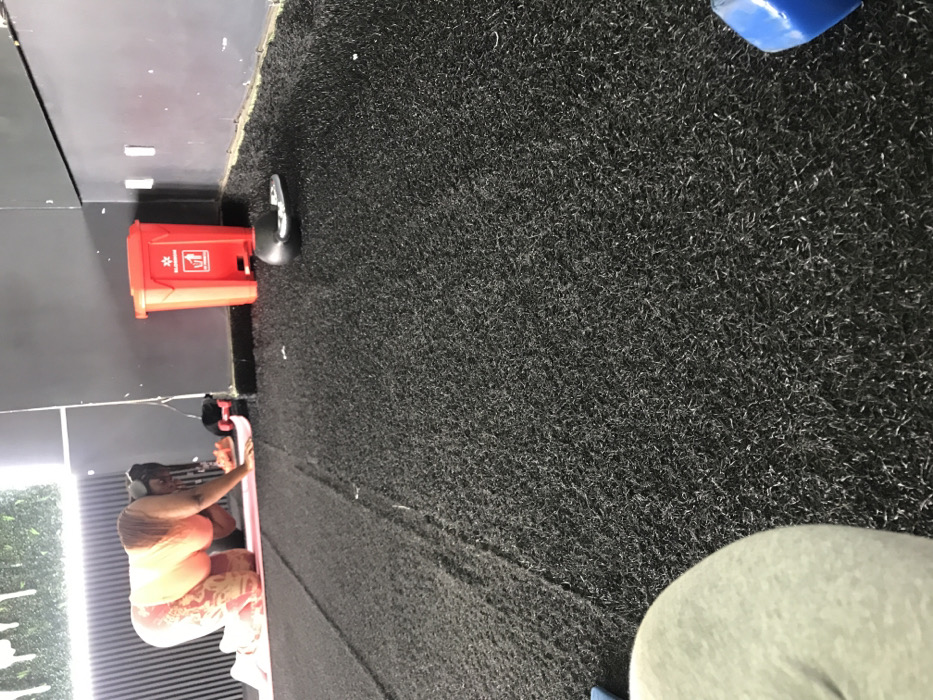 - "The image depicts an indoor fitness environment, likely a gym or workout studio, with dark gray walls and a black textured floor covering resembling artificial turf or rubber matting" by FM-HcLdJ2, licensed under CC BY 4.0