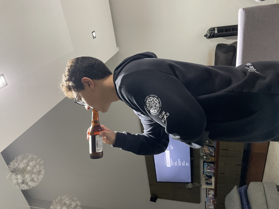 A young man in a black hoodie and glasses appears to be drinking from a brown bottle