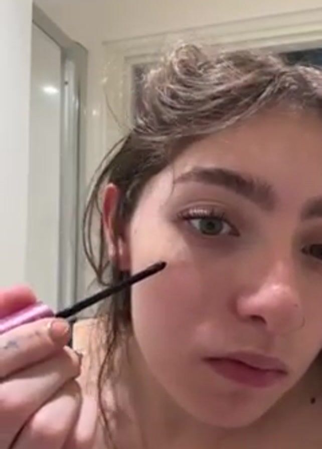 young woman in a bathroom applying makeup to her face