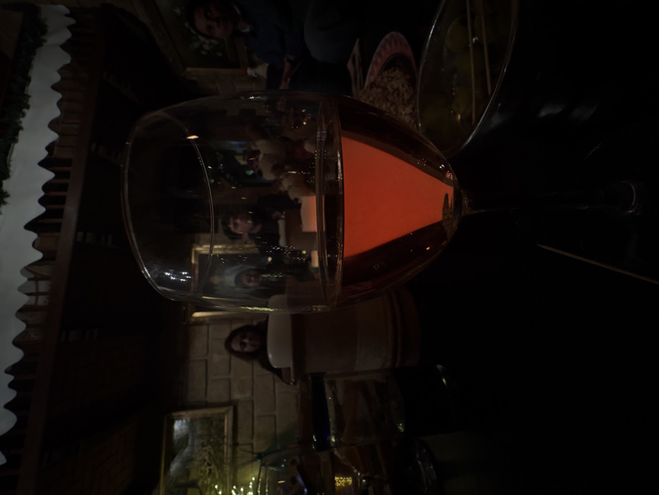 A tilted view shows a wine glass with red wine, reflecting people and surroundings. The glass sits on a dark surface, with a blurred plate in the background. Reflected figures suggest a dimly lit interior with decorative features. A blurred brick wall is visible in the reflections with a Christmas tree. The wine glass dominates the scene.