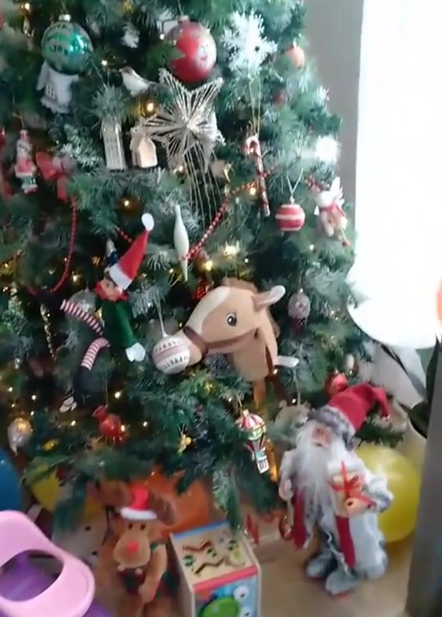 decorated Christmas tree indoors. The tree is adorned with ornaments, lights, and tinsel. At the base of the tree, there are several toys, including a purple ride-on car, a reindeer plush toy, a wooden toy cube, and a Santa Claus figure. The environment is a room with light-colored walls. The camera moves upwards to capture the entire tree.