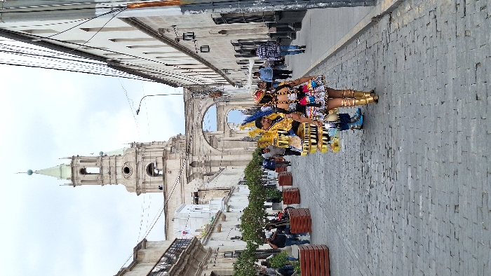 A vibrant Peruvian street scene features performers in colorful traditional attire. The performers wear ornate headdresses, gold leggings, and elaborately decorated vests. They play musical instruments with golden accents. Behind them is a grand stone cathedral with a tall, elegant spire. The street is lined with planters and cobblestones, and people can be seen watching the performance. The architecture suggests a historic city center.