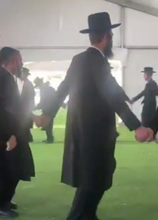 Inside a white tent, a group of men in dark attire and hats are dancing in a circle, holding hands