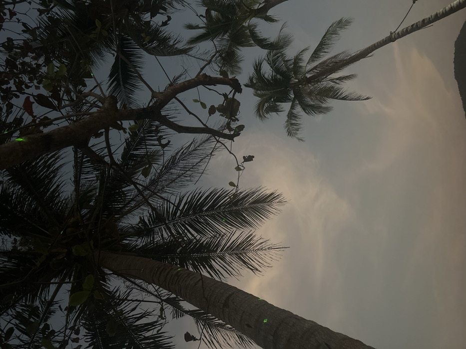 The image depicts an upward-looking view through a tropical tree canopy at an unspecified location within the city of Preah Sihanouk, Cambodia. The scene is illuminated by the fading light of dusk or the emerging light of dawn, casting the trees into silhouette against a gradient sky that transitions from a lighter, warmer tone near the horizon to a darker, cooler blue-grey overhead. In the foreground, a prominent, textured palm tree trunk extends vertically along the left side, with its fronds fanning out towards the center and right. Several small, bright green, circular light spots are visible on this trunk and its foliage. Towards the upper center, a second tree with distinctive, gnarled, dark branches and some scattered leaves is interwoven with the palm fronds. This tree also exhibits similar green light spots on its branches and leaves. Further in the background, additional palm trees are visible, some bearing small, round coconuts. Another cluster of green light spots is present among these distant palm fronds. The lower right portion of the image reveals the dark, undulating outline of a hill or mountain range against the lighter part of the sky. No human subjects or discernible human activities are present. The environment suggests a natural, outdoor setting, likely near a coastline or tropical landscape.