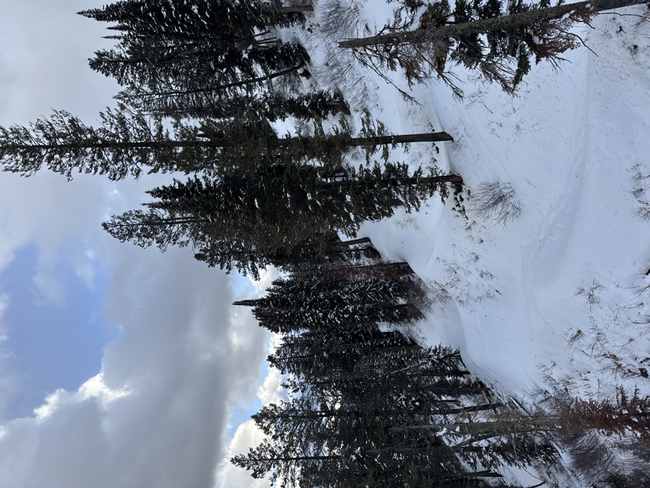 The landscape reveals a snowy terrain, dominated by tall evergreen trees. Patches of blue sky peek through the cloud cover. The ground is heavily blanketed in snow, showing tracks of recent activity. Dense clusters of trees create a dark vertical contrast against the bright snow. Some smaller bushes emerge from the snow cover.