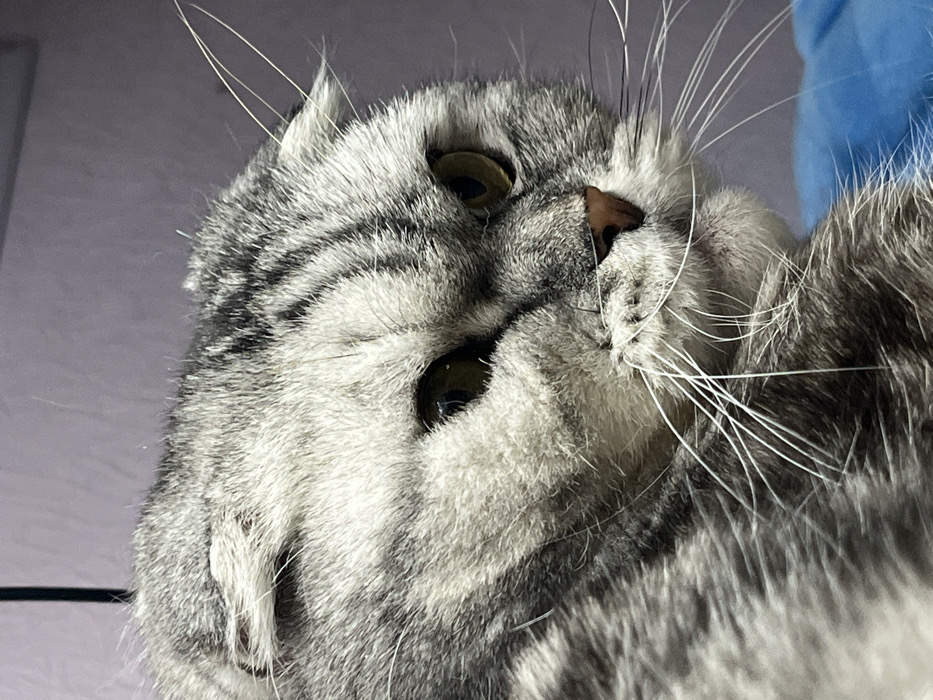 - "A close-up, medium-shot photograph depicts the head and upper body of a silver tabby Scottish Fold cat" by FM-khv1N2, licensed under CC BY 4.0