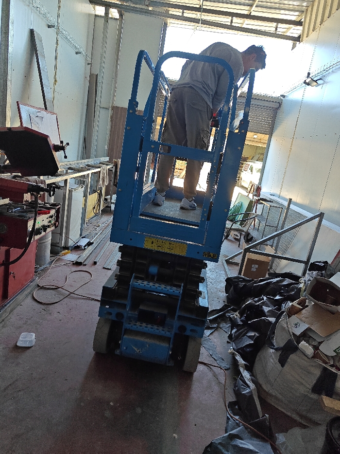 The image displays an interior view of an industrial or workshop space, possibly located in Kiryat Ata, Israel. No specific geographical markers are present within the frame to confirm the exact location. In the foreground and central focus, a single male individual is standing within the elevated platform of a compact, blue scissor lift. The individual is viewed from the back, wearing a light-colored long-sleeve shirt, khaki cargo shorts or pants, and white athletic shoes. He is bent forward, appearing to perform work on an overhead structure or wall, holding a tool (possibly a drill) in his right hand. The blue scissor lift features black base components, white wheels, and yellow warning decals on its structure. The environment is characterized by an unadorned concrete floor, which is dark red or brown. To the left of the scissor lift, a red industrial machine, possibly a tire changer, is visible with a black platform and an attached display or control unit. Several silver-colored metal profiles are laid flat on the floor, and a yellow electrical cord snakes across the floor from the left foreground towards the center. Walls on the left exhibit exposed metal framing and light-colored panels, while the wall on the right is constructed from corrugated metal sheeting. To the right of the scissor lift, the floor is cluttered with multiple black refuse bags, a large white sack filled with miscellaneous debris (including cardboard), and various metal frame components. The background features a large, open doorway or roll-up shutter, revealing bright natural daylight and partial views of an exterior area with what appears to be wooden pallets. The overall scene suggests an active workspace involving construction, renovation, or maintenance activities.