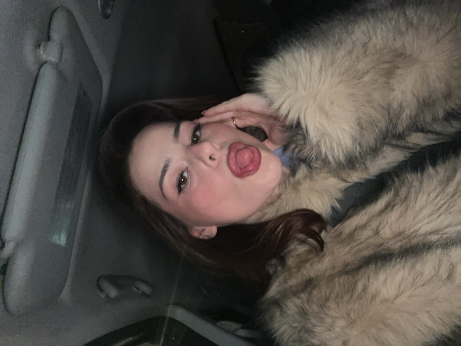 A woman with brown hair and light skin is seated in a car. She has her tongue sticking out and is wearing a large, furry coat. Her hand is near her face, and she is looking at the camera. The car's interior is visible, including the sun visor. The image has a slightly tilted perspective.