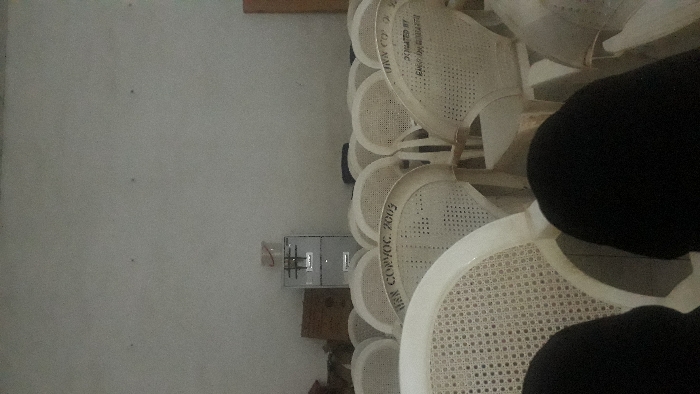 A collection of white plastic chairs are arranged in rows. The chairs have circular backs with a perforated design. Some of the chairs have writing, including "REN COP/VOC 2003," and "UKN CRY 2 DONATED BY ENGR. GODILVAH." A dark-colored object is on top of some of the chairs. A utility box is visible on the wall near the chairs. The wall is a light grey color.