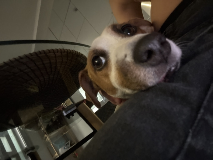 The image presents a close-up, low-angle perspective of a short-haired dog with white and brown markings. The dog's face is predominantly white with distinct brown patches around its large, dark eyes, which are directed towards the camera. Its black nose is visible in the foreground, slightly out of focus, and a small portion of a pink tongue is discernible. The dog's head is resting on a dark grey, textured fabric, consistent with an article of clothing. A segment of a human's light-toned skin, indicative of an arm or shoulder, is visible behind the dog's head. The background on the left features a large, dark brown, circular object with a woven pattern, resembling a rattan lampshade or basket. Below this, a reflective glass surface, likely a table, is present. The overall environment appears to be an interior setting with ambient lighting, exhibiting blurred architectural elements in the deeper background. The scene is situated in the city of Varna, Bulgaria.