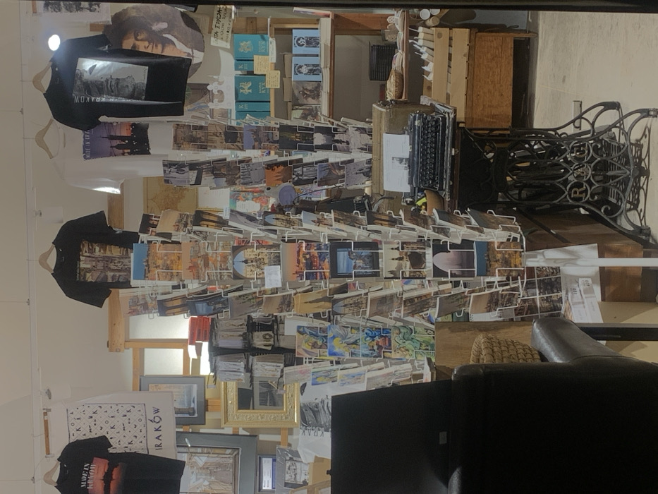 The image displays the interior of a souvenir or gift shop located in Krakow, Poland