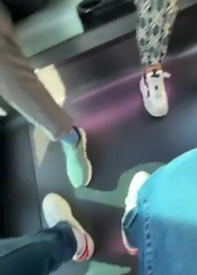 interior of a vehicle, possibly a bus or tram, with four pairs of legs and feet visible