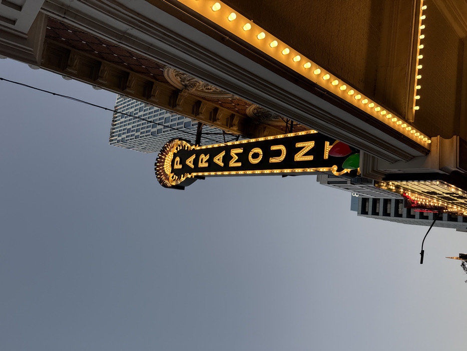 An eye-level shot showcases the Paramount Theatre's sign illuminated with bright, yellow lights
