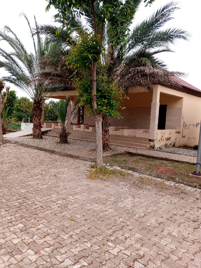 The image depicts an outdoor scene at Immigration Quarters, Nigeria. In the foreground, a light-colored interlocking paver pathway extends across the frame. To the left and center-right, a beige-colored, single-story building with a red-brown sloped roof is visible. The building features a covered porch area with multiple steps leading up to it and two square pillars supporting the roof overhang on the right side. Peeling paint and dirt stains are present on the lower portion of the building's right wall. A dark, open doorway is visible on the right side of the porch. Several trees are positioned around the building. Two mature palm trees with large fronds are prominent, one on the far left and another behind a central, leafy deciduous tree. A smaller palm sapling stands closer to the building's steps. Additional green foliage from distant trees is visible in the background on the left. The ground immediately adjacent to the building's steps consists of a narrow strip of dirt with sparse, dry vegetation, separated from the paved area by a low curb. The sky above is overcast or hazy, appearing light gray. No people or active interactions are present in the scene. A thin, dark pole is partially visible on the far right edge of the frame.